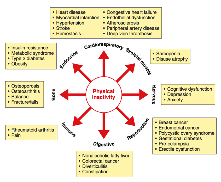 Se ha observado que la inactividad física es el cuarto factor de riesgo en lo que respecta a la mortalidad mundial (6% de las muertes registradas en todo el mundo). Además, se estima que la inactividad física es la causa principal de aproximadamente un 20-25% de los cánceres de mama y de colon, el 27% de los casos de diabetes y el 30% de la carga de cardiopatía isquémica.