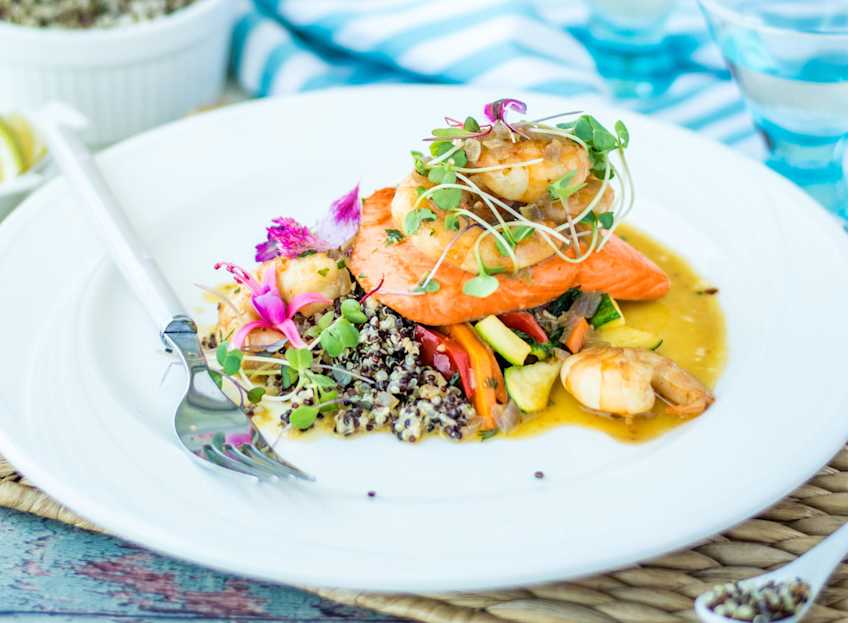 Almuerzo | Ensalada verde con espinacas, salmón a la plancha y quinoa | Proteínas completas, omega-3 y hierro |